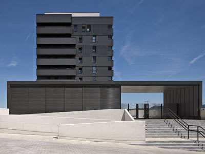 Durante el desarrollo del proyecto se tuvieron que resolver varios condicionantes, el primero de ellos era la acusada linealidad de la parcela, que cuenta con unas medidas de 135x20m. Esta linealidad se combina, al mismo tiempo, con un desnivel entre los extremos más alejados de la misma de más de 7 metros. Además de esto, el proyecto debía disponer de un local comercial que fuese apto para la implantación de un supermercado de barrio, con una superficie de unos 1.000m2, sin embargo, ya desde el planeamiento urbanístico quedaban determinadas las localizaciones de los cuerpos edificados, integradas en el ritmo de pequeñas torres ubicadas en línea en esa zona del plan parcial. Además, la parcela es paralela al parque central del polígono, lo que provoca una focalización en los elementos de interés del entorno.