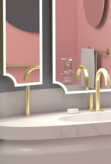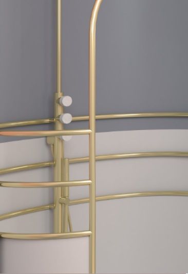 • Oro, elegido por el diseñador para la grifería. Piezas de metal, tratadas como joyas, recubiertas de una fina capa de oro. Este es el caso también de la estructura de ducha arqueada; el diseñador se inspiró para crear este modelo en una ilustración del archivo de Jacob Delafon.