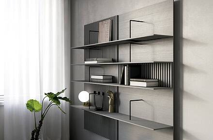 Su versatilidad se amplía en combinación con otras colecciones de la marca, especialmente con MITRA. Juntas, permiten configurar sistemas más completos en los que conviven librería, almacenaje y superficies de apoyo, dando respuesta a diferentes usos sin perder coherencia formal.