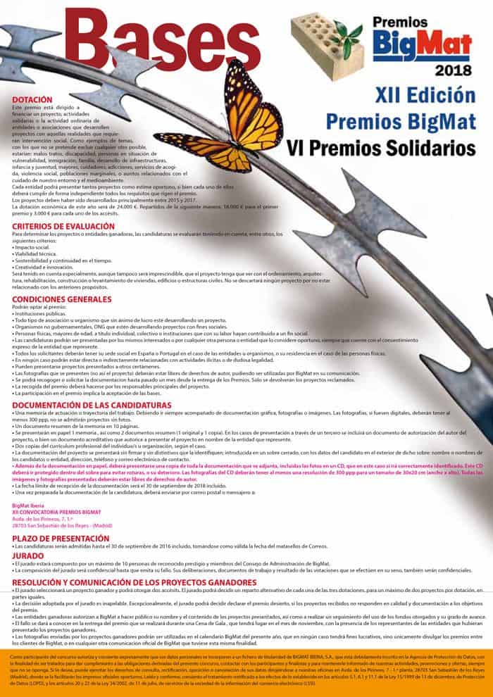 El jurado estará compuesto por un máximo de diez personas de reconocido prestigio y por miembros del Consejo de Administración de BigMat. Se valorará el impacto social, la viabilidad técnica, la sostenibilidad y continuidad en el tiempo y la creatividad e innovación de los proyectos. Cada entidad podrá presentar tantos proyectos como desee, siempre y cuando se cumplimenten de forma independiente y cumplan los requisitos. Los proyectos deben haber sido desarrollados principalmente entre 2015 y 2017. Todos los solicitantes tienen que tener su sede social en España o Portugal en el caso de las entidades u organismo; si se trata de una persona física, su residencia.