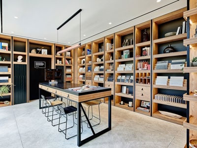 El showroom incluye áreas inmersivas y experienciales como el Atelier, un workshop con una biblioteca completa de materiales donde las superficies de Cosentino se combinan con otros productos como papeles pintados, telas, tiradores, iluminación y grifería. Además, cuenta con displays digitales que permiten apreciar los colores y acabados de los productos en tamaño real, zonas de exposición de fachadas y baños, y una cocina funcional para showcookings y reuniones.