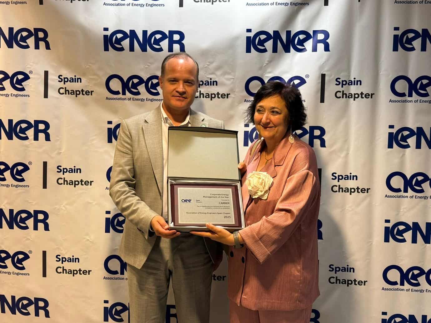 La empresa Carrier, líder mundial en soluciones de climatización, ventilación y refrigeración sostenibles, ha sido galardonada con el Premio a la Mejor Empresa Energética del Año (Corporate Energy), otorgado por la Association of Energy Engineers – Spain Chapter (AEE). El reconocimiento se entregó durante la sexta edición del Congreso Internacional de Ingeniería Energética (iENER’25), celebrado en Madrid, donde se dieron cita los principales actores del sector energético para debatir sobre innovación, eficiencia y sostenibilidad.