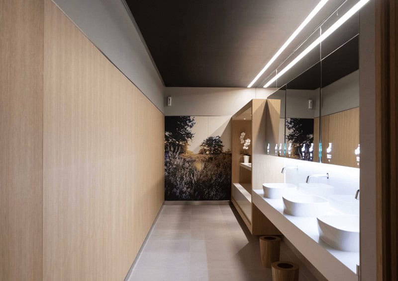 Lo más singular de esta intervención es la reestructuración de las zonas centrales, en las que se sitúan las “islas” circulares de autoservicio, auténtico eje neurálgico de la oferta. Se ha mantenido por su singularidad el “platillo volante”, elemento preexistente que preside la Sala y alberga los conductos de climatización.