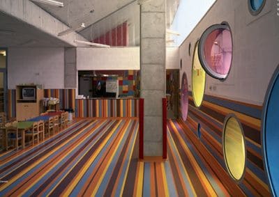 Como un juego infantil, el programa, los materiales y las ideas se configuran como las piezas que componen el juguete, que los arquitectos han tenido que montar. El proceso es simple: plantearse el edificio para dar respuesta a las necesidades de sus usuarios que, en este caso, tienen entre 0 y 3 años. Para ellos la casa se reconoce por la cubierta inclinada, y este aspecto se incorporará a la guardería, así como por sus puertas y ventanas, que también aparecen. Pero no sólo la simbología aquí es fundamental, el edificio en sí, como material didáctico, tiene que activar la mente de los niños, activar sus funciones cerebrales, e incluso divertirles y fomentar su conexión social. ¿Es posible meterse en la piel de un niño de 3 años y dar solución a un edificio?