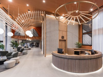 El hall de acceso, con su imponente diseño de celosía cerámica blanca y una lámpara suspendida de madera, sirve como punto focal del edificio, conectando visualmente los diferentes ambientes. Desde allí, una calle interior bordeada de bancos de cerámica terracota vidriada y vegetación conduce al salón social, un espacio multifuncional destacado por elementos como una barra, una tribuna escalonada y una chimenea, todos iluminados por lámparas diseñadas específicamente para el proyecto.