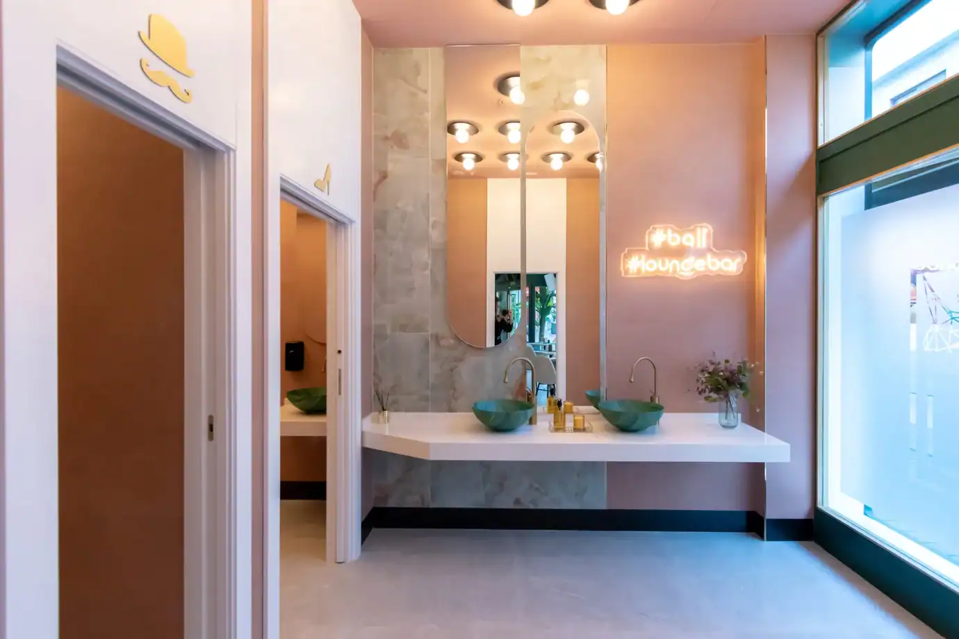 En espacios horeca, el baño suele resolverse como un área secundaria. Aquí se trata como una extensión del proyecto. La presencia de luz natural añade un matiz diferenciador. El baño deja de ser solo funcional y pasa a ser una microarquitectura, un momento de pausa dentro de la experiencia del local.