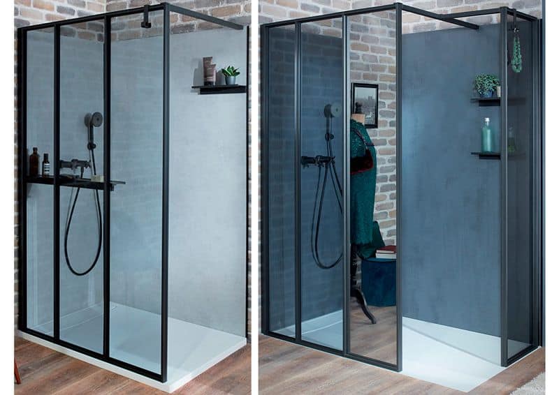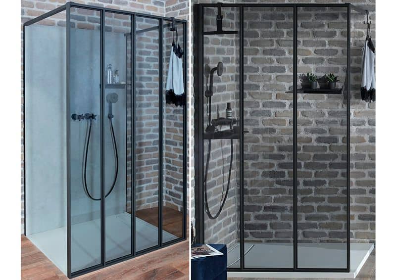 Bajo la premisa de la personalización, esta mampara se inspira en las cristaleras de los talleres de los artistas. La estética de los perfiles en negro, consigue crear un conjunto arquitectónico perfecto que dará una estructura al baño inimitable.