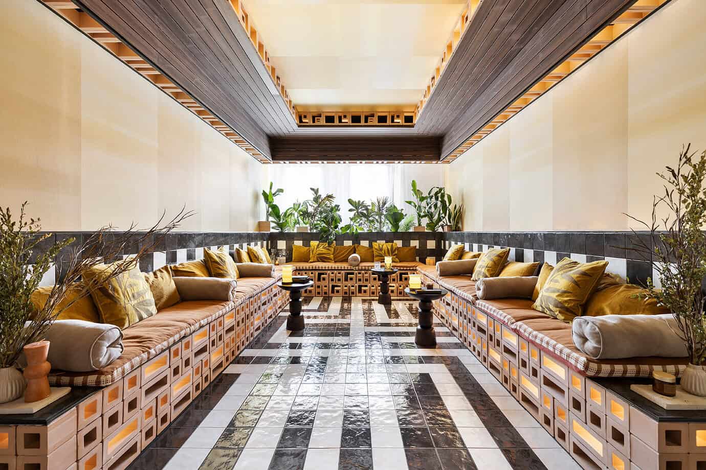 Finalmente —aunque fuera del concepto de “vida sana”—, el club de fumadores “El viaje del humo” es la propuesta del estudio Impar Design. Su leitmotiv se inspira en los secaderos de tabaco y en los antiguos fumoirs palaciegos del siglo XIX. La estancia cuenta con celosías que filtran la luz natural para crear atmósferas cambiantes, mientras que la madera, los mosaicos y el solado con azulejos se integran con la artesanía y la arquitectura sensorial.