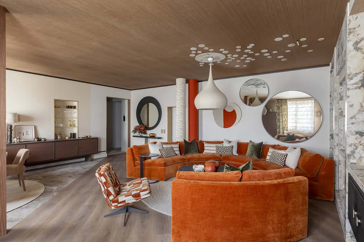 Otro espacio para el disfrute y la gastronomía es el salón comedor de S de Studio, “La vie, chez nous”, dentro del espacio promocional de PH Collection. El diseño se inspira en la estética de los años setenta para crear un ambiente de relajación, con maderas y textiles envolventes que se combinan con patrones geométricos y tonos naranjas y verdes.