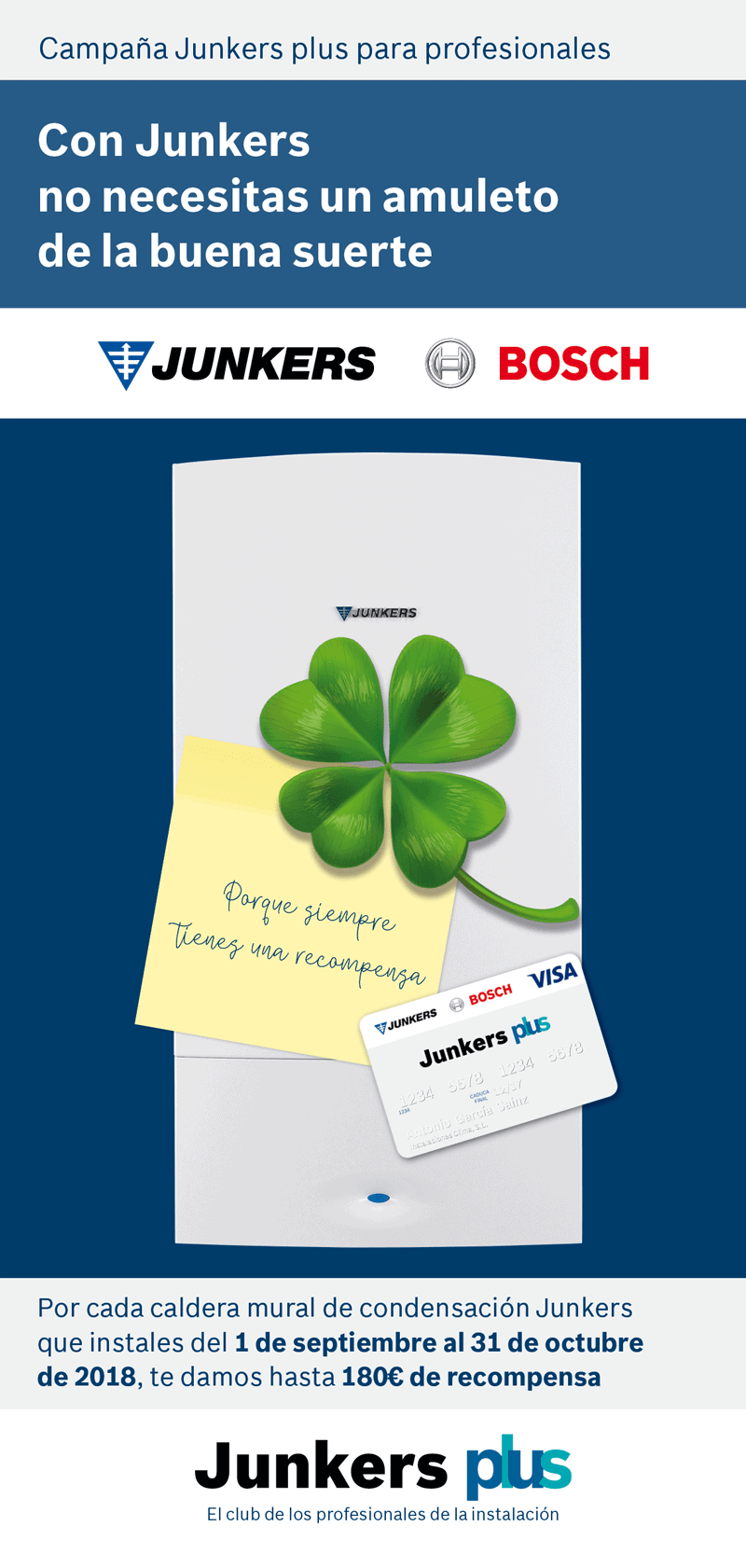 Este otoño, con Junkers no necesitas un amuleto de la buena suerte. Con Junkers, marca de la división Bosch Termotecnia perteneciente al Grupo Bosch, los instaladores pueden recibir una recompensa de hasta 180 euros en su tarjeta de socio por cada caldera mural de condensación que coloquen este otoño.