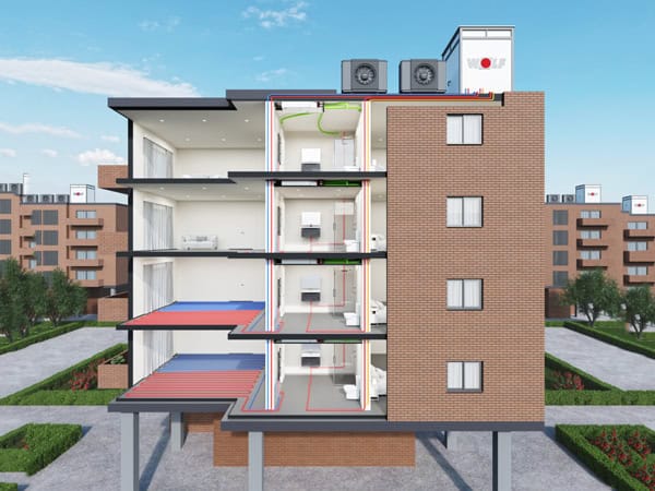 Esta solución de Wolf puede trabajar en instalaciones centralizadas con emisores de hierro fundido a temperaturas de entre 60º y 70º. En instalaciones híbridas, aborda el 60% de la demanda total de energía con un 30% de potencia instalada a carga parcial, incluso para la producción de Agua Caliente Sanitaria (ACS) a alta temperatura.