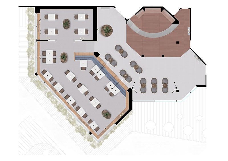 El espacio superior del snack-bar, está conectado directamente con las terrazas y lo concibieron como un espacio más dinámico, aunque emplearon el mismo criterio y elementos para resolverlo.