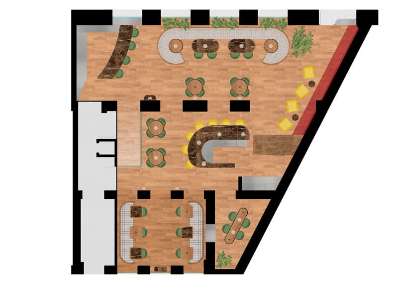 Estos elementos aportarían toda la funcionalidad al espacio y su diseño generaría el nuevo concepto estético del local. El resto de la actuación, consistiría en la generación de un contexto espacial neutro y fluido mediante la intervención obligada sobre las dos crujías de carga del edificio que tenían que ser reforzadas, la eliminación elementos eclécticos existentes, el pintado de los techos y la creación de una iluminación completamente diferente a la existente.