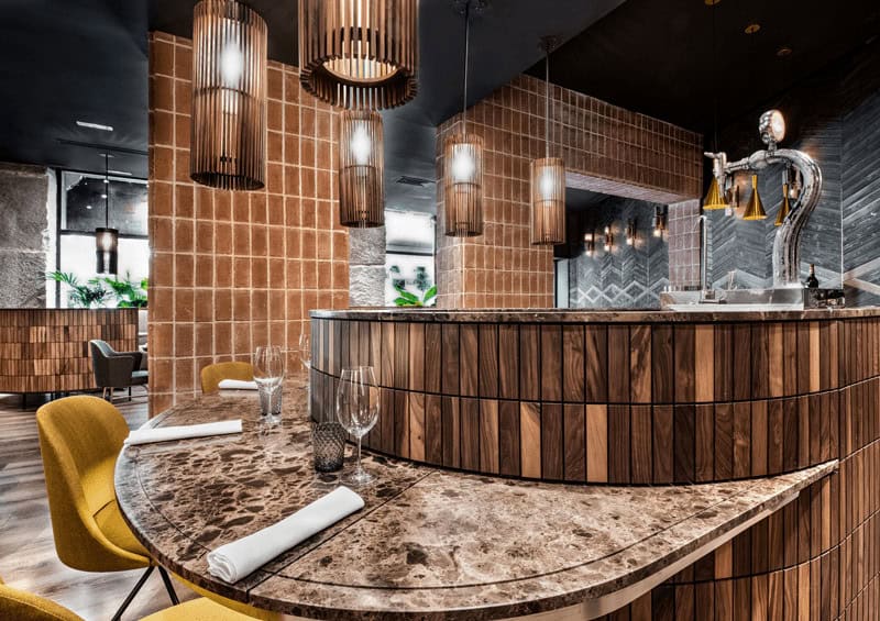 En estas piezas, el nogal se combina con otros materiales naturales que resuelven cada una de las partes funcionales de cada elemento. Así el mármol, marrón emperador se utiliza para la realización de las superficies horizontales para uso gastronómico combinado siempre con detalles en nogal. El metal aparece para resolver elementos auxiliares como zócalos, hornacinas o la estructura de las luminarias. Y la tela, como base de los asientos tapizados de sillas y sofás con un marcado despiece gallonado. Todos ellos, materiales naturales integrados bajo un mismo y riguroso criterio de instalación.