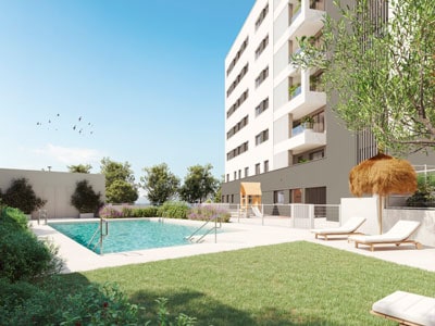 Cada apartamento en Zitizen ofrece amplias terrazas exteriores con diversas orientaciones, acceso a garaje con plaza de aparcamiento y espacio de almacenamiento. Además, el complejo residencial cuenta con exclusivas zonas comunes diseñadas para el disfrute de sus residentes, incluyendo una piscina exterior, sala gourmet, zona zen, área de juegos y espacios ajardinados.