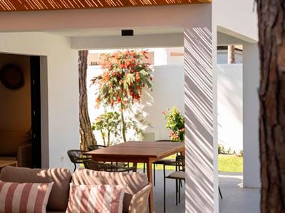 En términos estéticos y funcionales, el proyecto se centra en lograr una conexión constante entre el interior y el exterior. El diseño apuesta por un estilo equilibrado y sereno, de inspiración natural y minimalista, donde destacan las líneas puras y los espacios abiertos. Las estancias, frescas y luminosas, evitan los excesos decorativos y reflejan un marcado carácter mediterráneo. La paleta de colores combina tonos crema con materiales naturales como el bambú y la madera de roble aceitado, contrastando con el negro de las carpinterías exteriores y el verde del entorno natural.