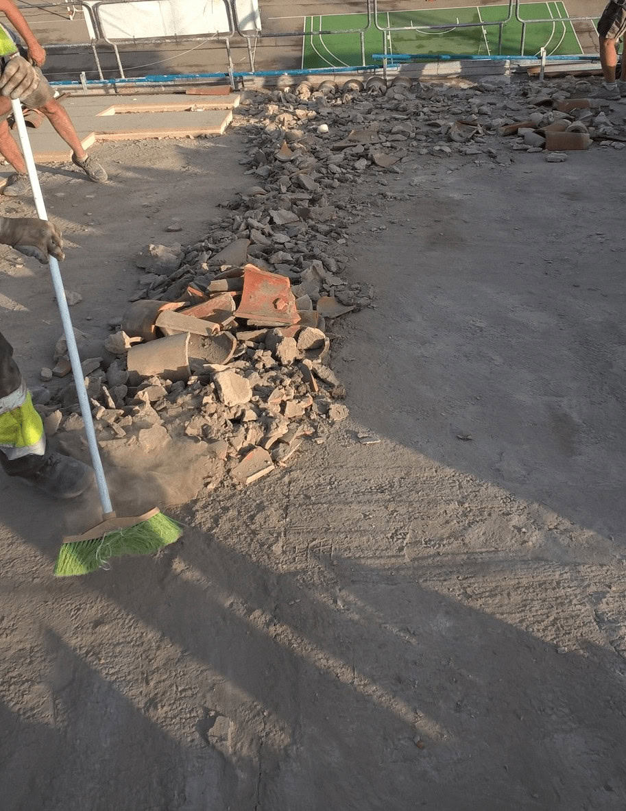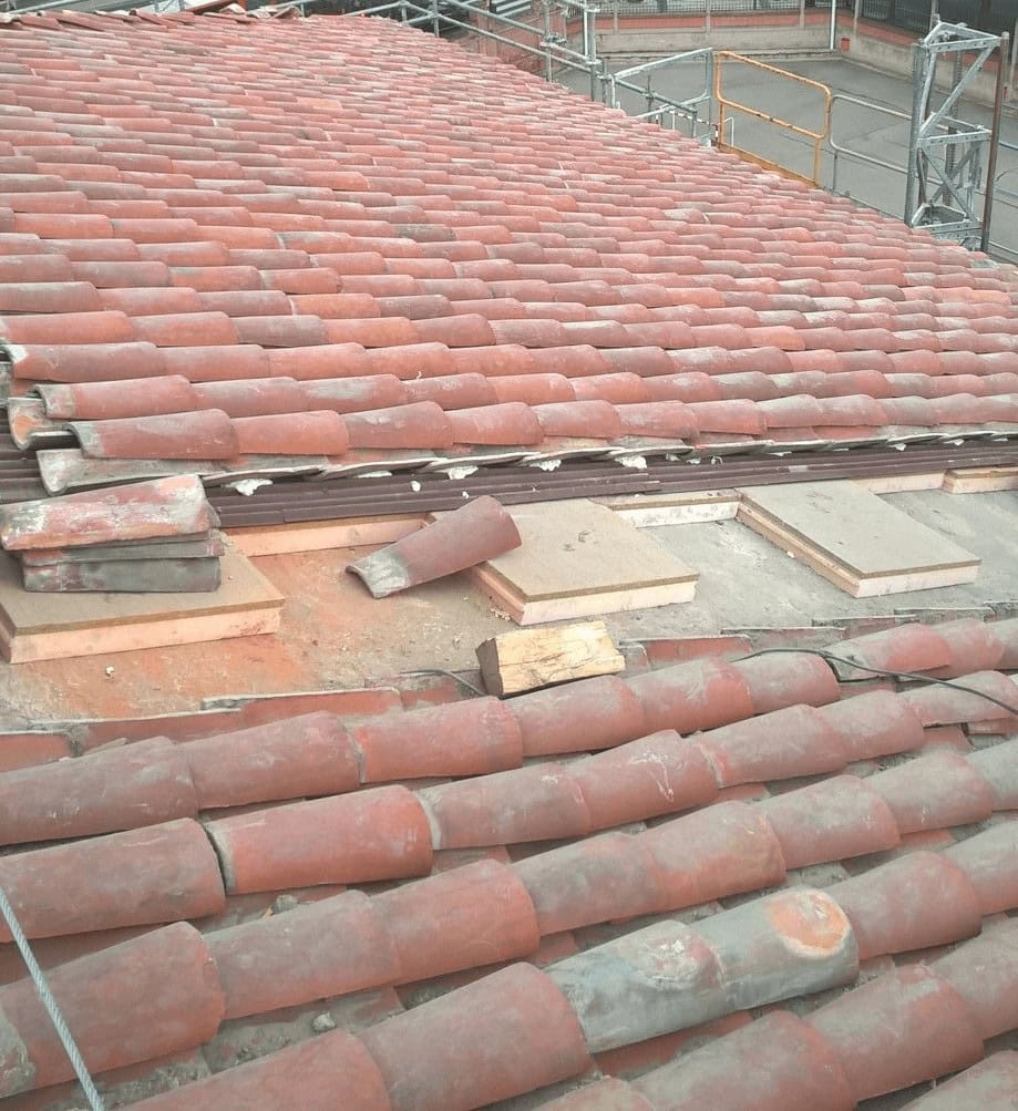 En primer lugar, se ha retirado la teja cerámica curva original recuperándose la mayor parte de tejas para su posterior reutilización como tejas canales y cobijas. Posteriormente, se ha mantenido y limpiado la capa de compresión de mortero existente debajo de las tejas, ya que presentaba un estado bastante regular y planimétrico, aunque con una consistencia demasiado débil como para soportar la fijación de los paneles aislantes del SATE de Cubierta.