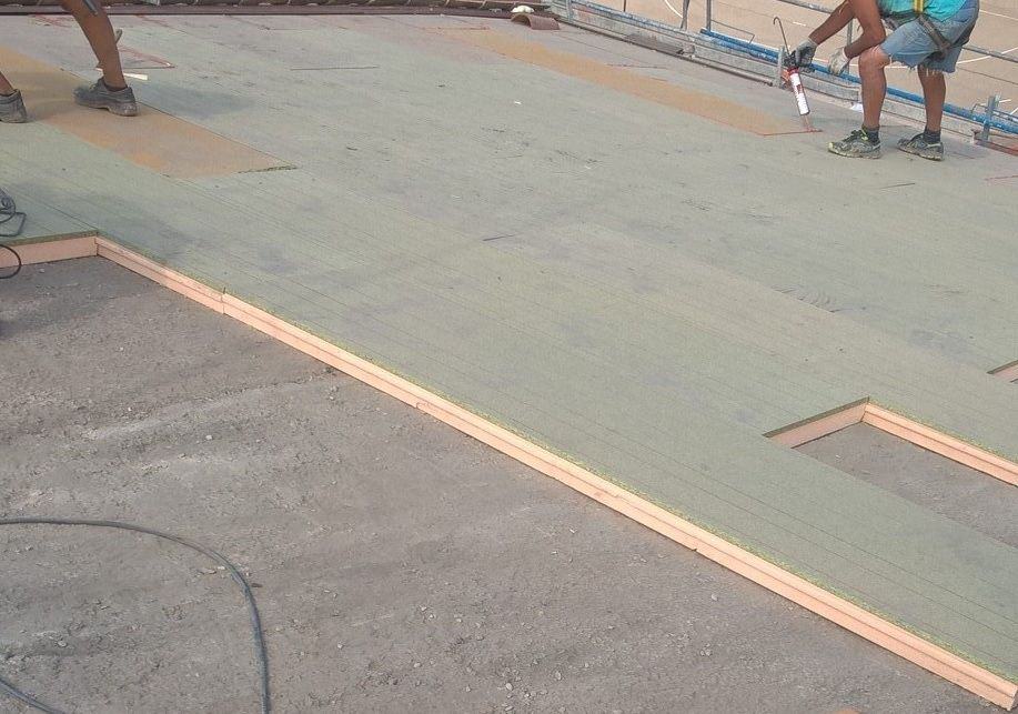 Una vez que la capa de compresión está limpia, se procede a la disposición de los medios paneles sándwich ONDUTHERM BASIC, elementos que proporcionan el aislamiento térmico en cubierta, directamente sobre esta. En este caso, la fijación de los paneles aislantes de cubierta se ha realizado con tirafondos para madera, atravesando la capa de compresión para llegar hasta la estructura existente debajo.