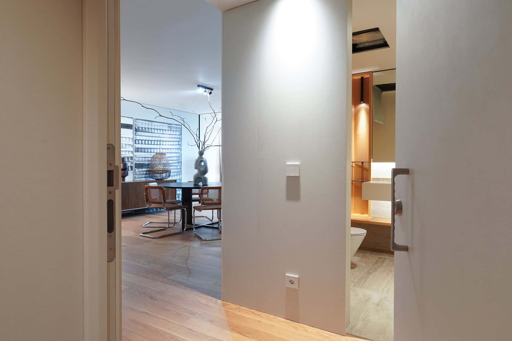El cuidado en la selección de materiales es evidente en todo el proyecto. Las entradas de los apartamentos están revestidas con lacados de la gama Lacdor Pure White RAL9010, lo que aporta luminosidad y un toque de refinamiento. Por su parte, las zonas comunes presentan un revestimiento de madera natural Naturdor® Roble, que resalta la autenticidad de la naturaleza, y Dekordor® HD, un material con alta resistencia y fácil mantenimiento, ideal para áreas de alto tránsito.