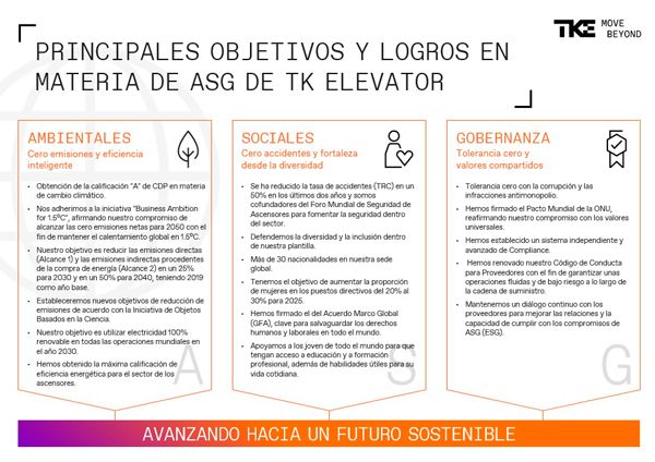 En TK Elevator, los objetivos empresariales y de sostenibilidad van de la mano. La compañía líder del sector de la elevación y escaleras mecánicas ha presentado su informe de evolución ESG en el que destaca los grandes hitos y sus objetivos en cuanto a sus compromisos en materia de sostenibilidad medioambiental, social y de buen gobierno.