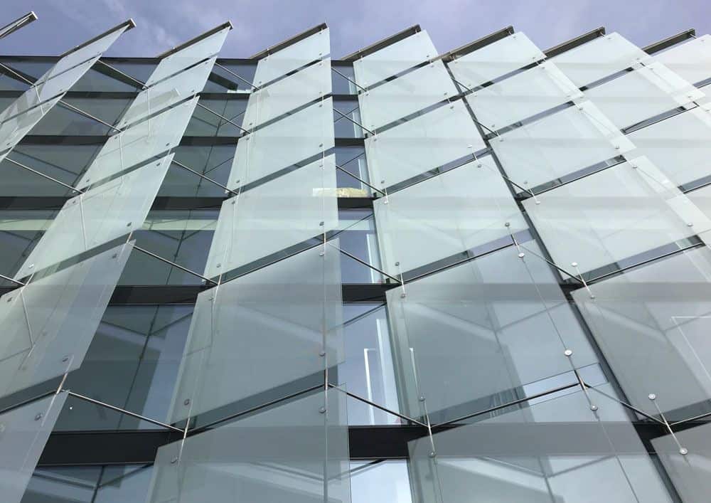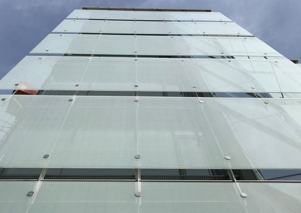Cada una de las seis unidades de 10 metros han sido laminadas con Sentryglass para añadir seguridad y aislamiento acústico a la envolvente. Además. todas las piezas fueron templadas y sometidas al HST, y serigrafiadas digitalmente con motivos de color blanco que aportan un diseño singular de alta durabilidad al acabado de las misma.